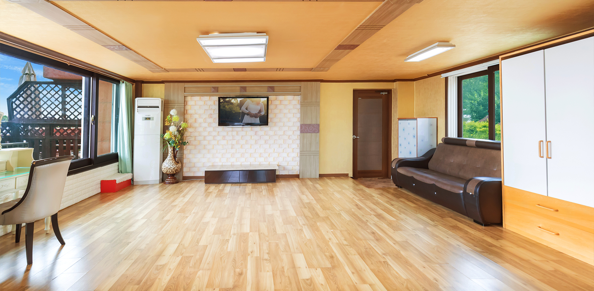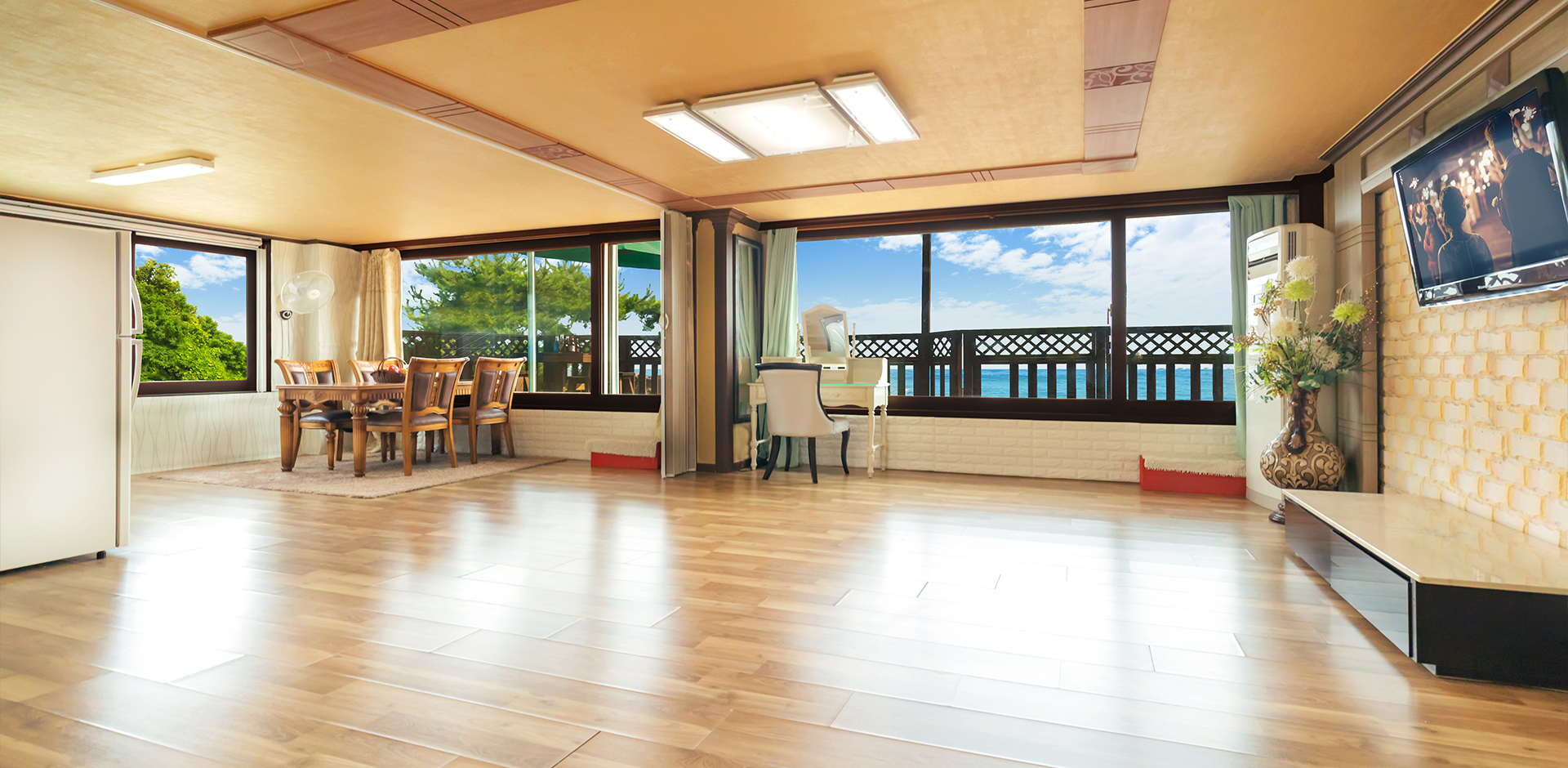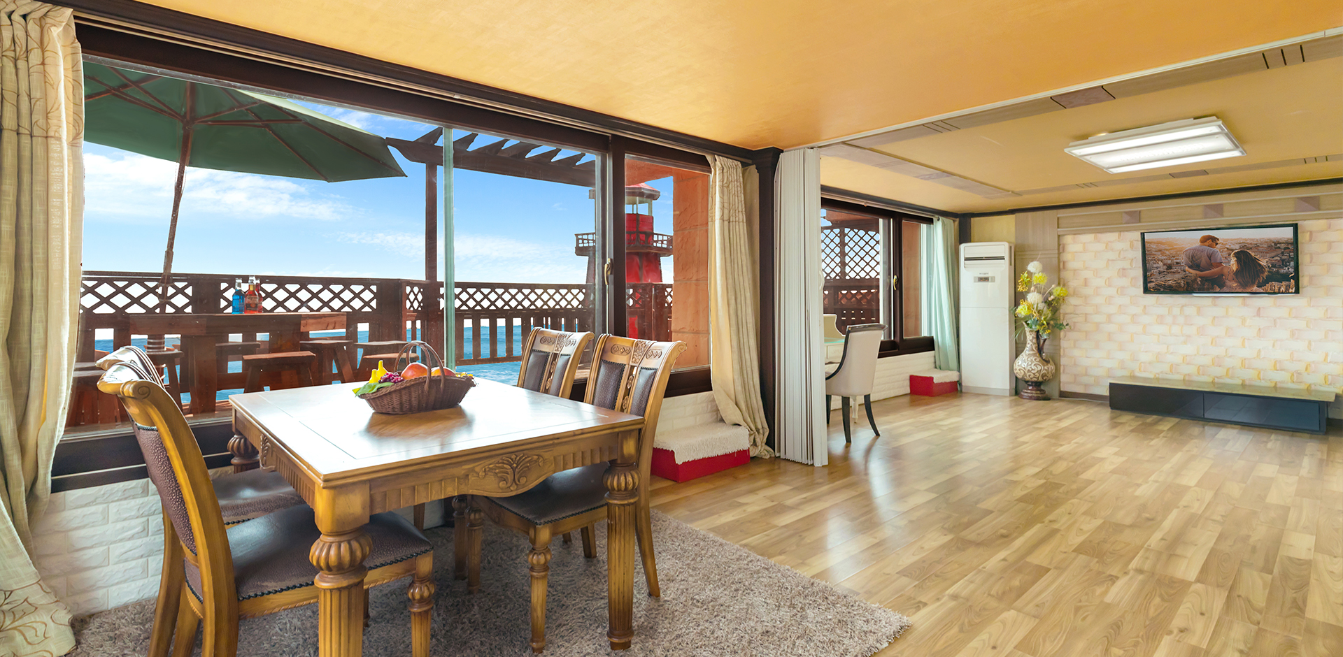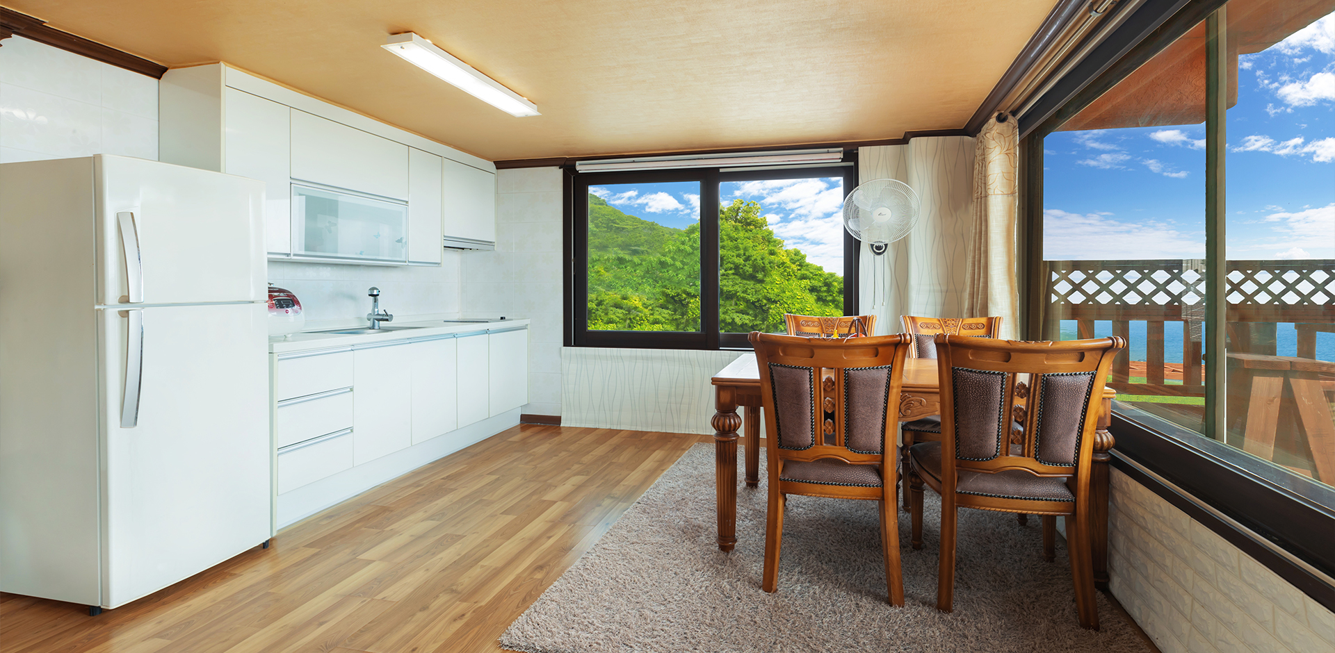 - 객실 비치품목: 냉장고, 싱크대, 전기밥솥, 식기세트, 벽걸이TV(QOOKTV), 식탁, 드라이기, 에어컨, 수건, 세면용품