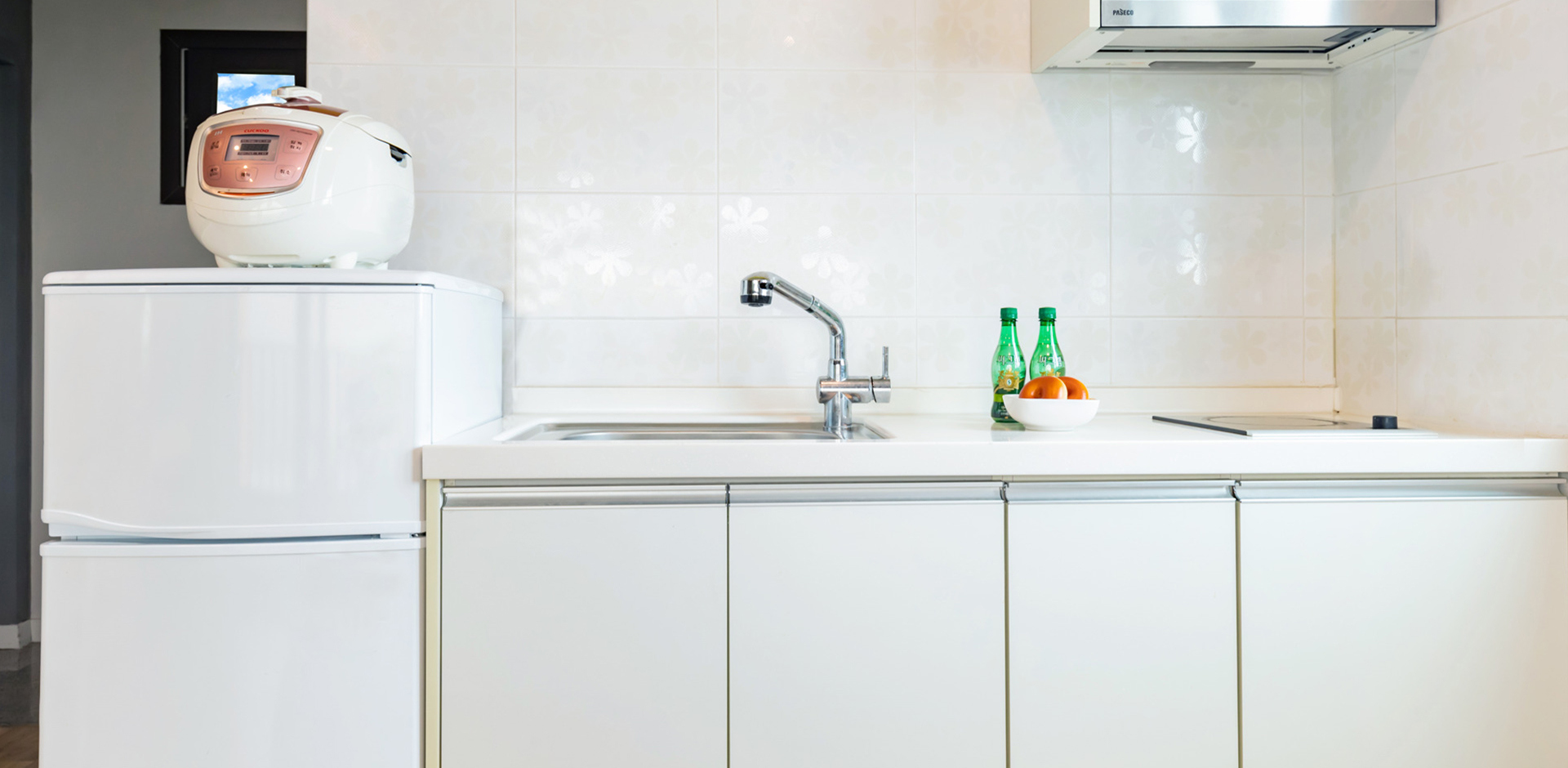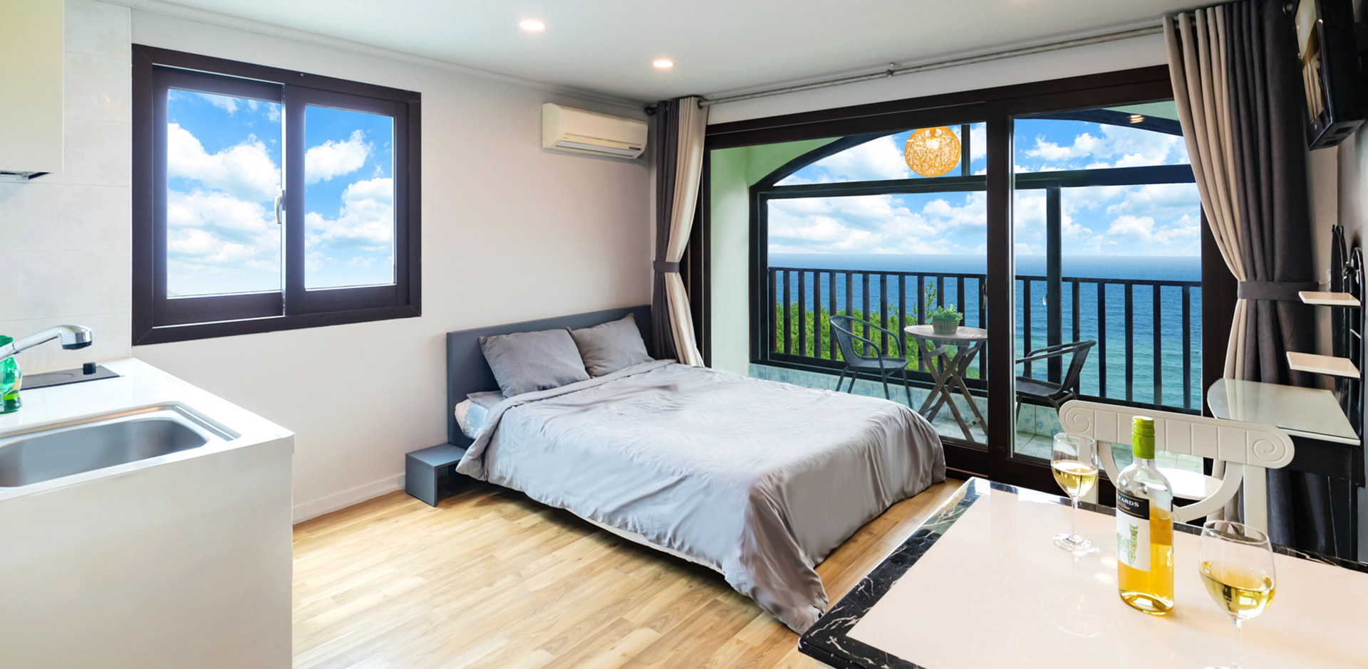 - 객실 비치품목: 냉장고, 싱크대, 전기밥솥, 식기세트, 벽걸이TV(QOOKTV), 식탁, 드라이기, 에어컨, 수건, 세면용품